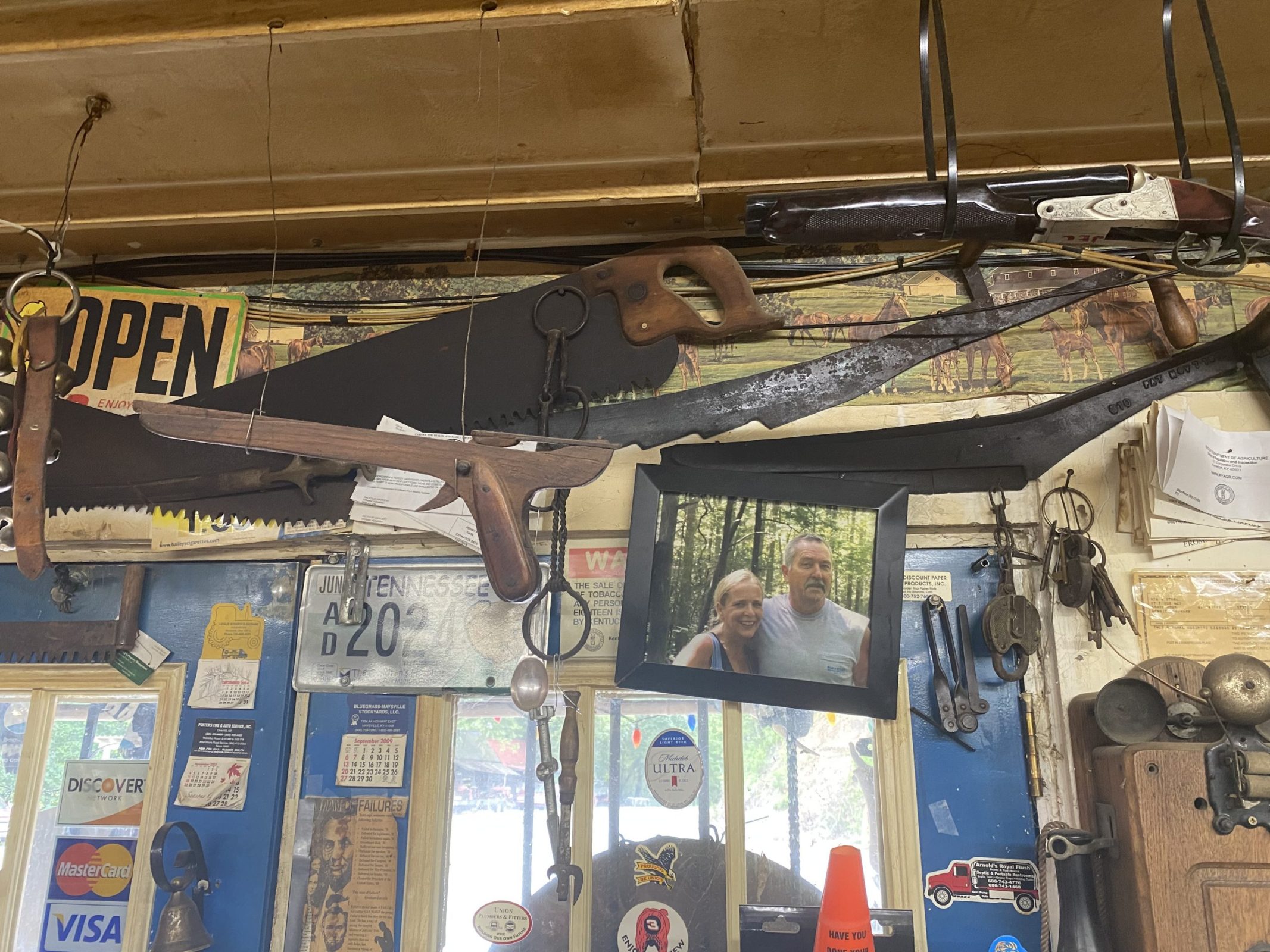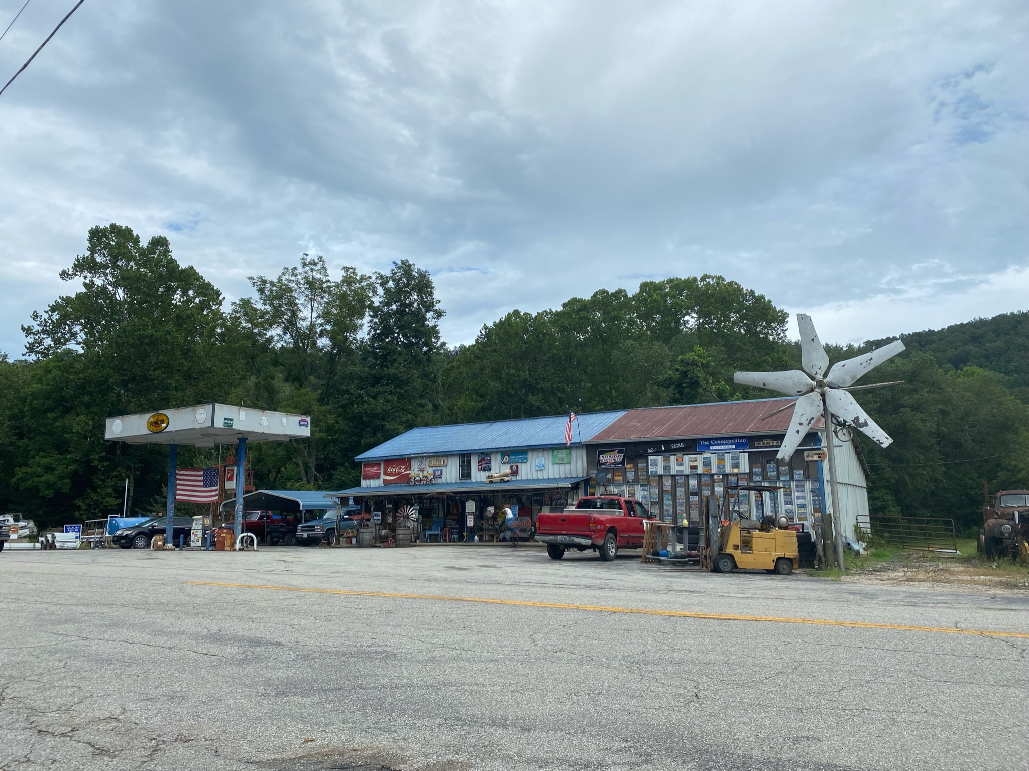 Sandy Hook’s Big Four Store enshrines the hope that the Rust Belt’s future will be like the past. Driving up the mountain, the store appears suddenly at a crossroads. Besides the gravel road, it is the only sign of civilization around. A massive airplane-windmill contraption is suspended on a pole out front. The lone gas pump must have rusted since the 1950s. Inside, Donnie watches a Western on a flatscreen. His antique collection and hand-crafted metal sculptures share the shelves with pickled pork hocks and bottles of pop. Vintage guns and a beehive hang from the ceiling. “They’re not for sale,” Donnie says, standing at the cash register in his overalls with his sun-worn, cheerful face. It is not clear if anything is for sale. At the bottom of the glass cashier booth is a little red hat that reads, “President Trump 2024: Keep America Great.”